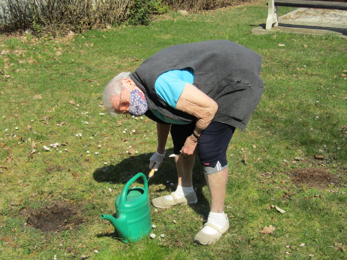 Naštěstí i při současném omezení se někteří klienti o bylinkové záhony starají a navíc vysadili postupně na zahradě nové květiny. Senioři dbají na každodenní zálivku, a proto se našim bylinkám opravdu daří. Již nyní se klienti mohou těšit z máty a meduňky nebo si nakrájet čerstvou pažitku. Brzy pokvete mateřídouška a tymián.