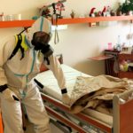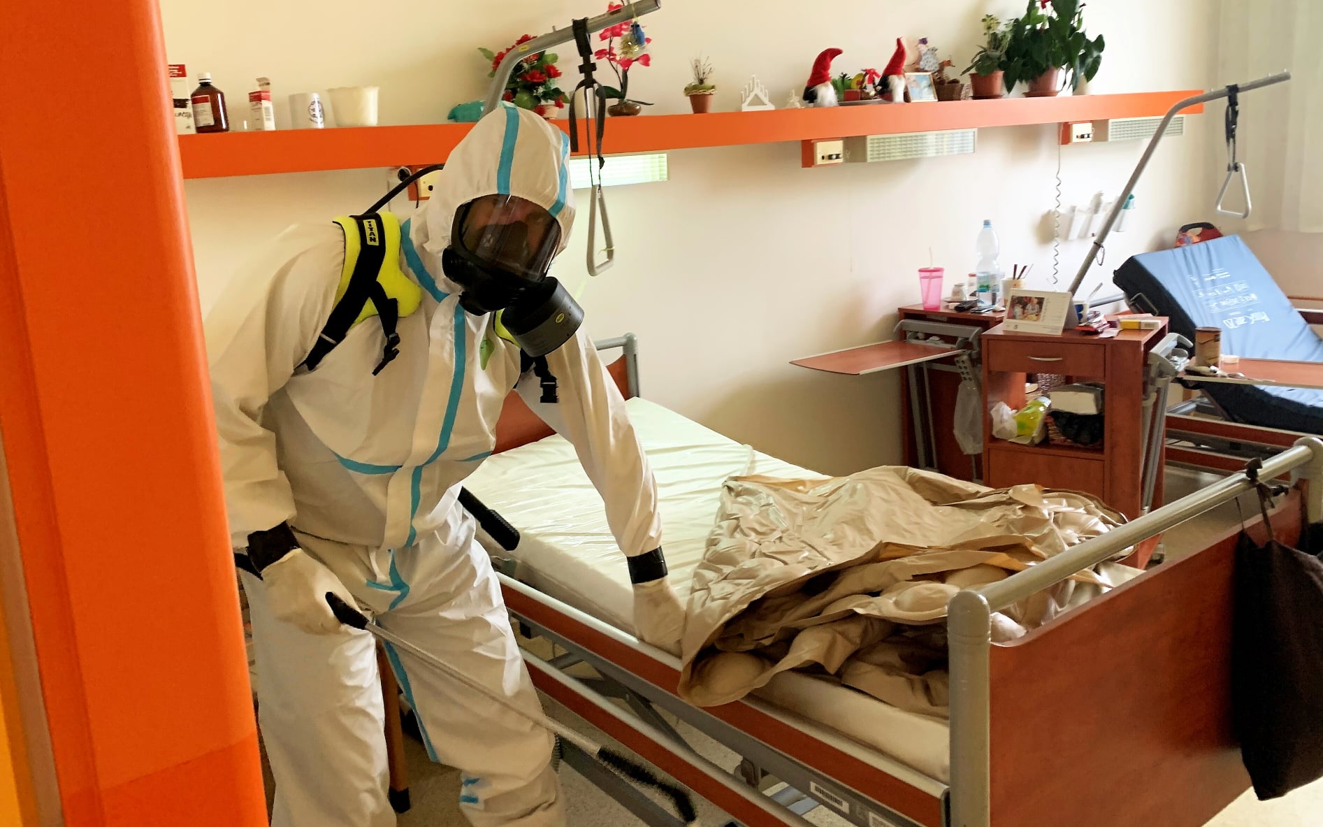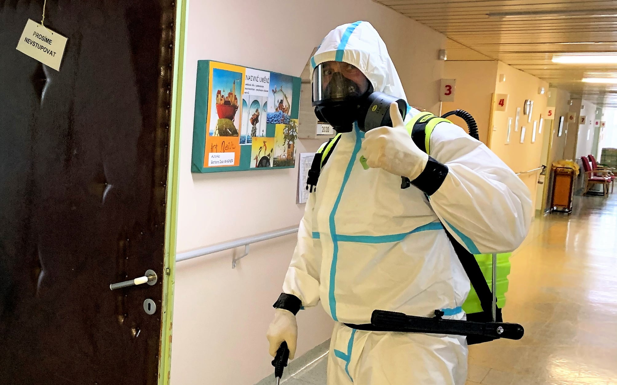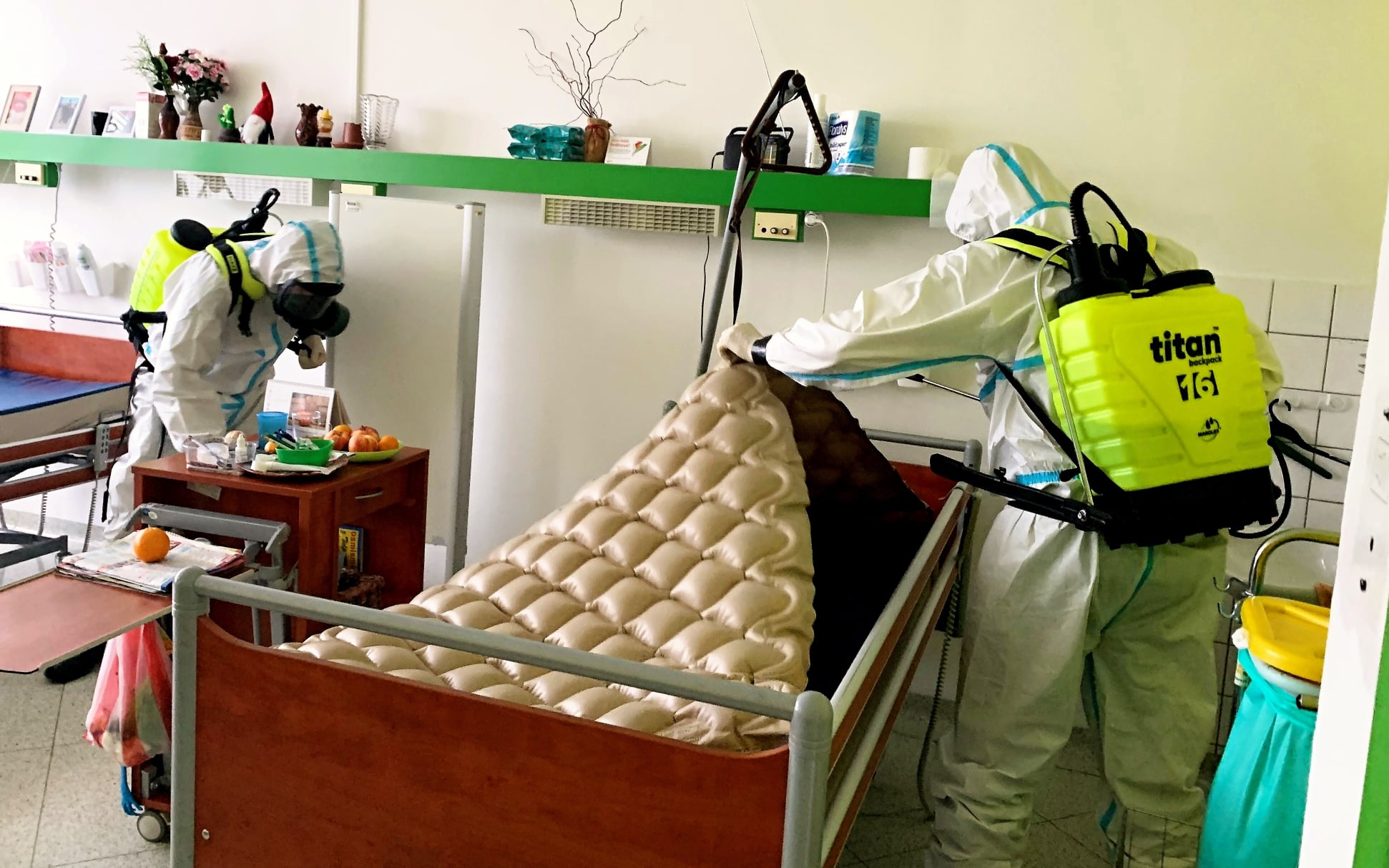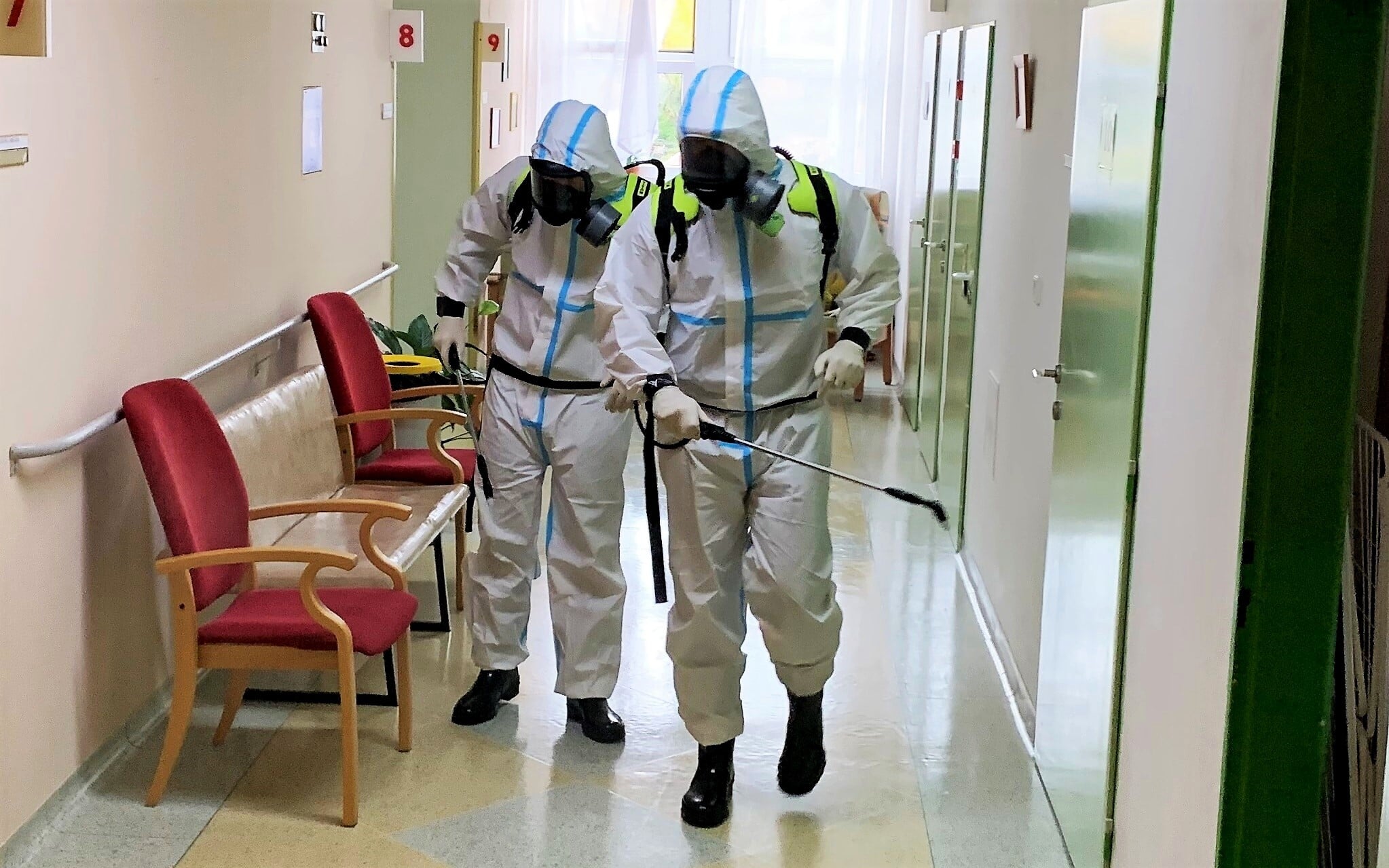 V prostorách Domova pro seniory v Kadani probíhá desinfekce. Hasiči v ochranných oblecích, rukavicích a ve speciálních maskách s filtry za plného provozu desinfikují všechna místa Domova.