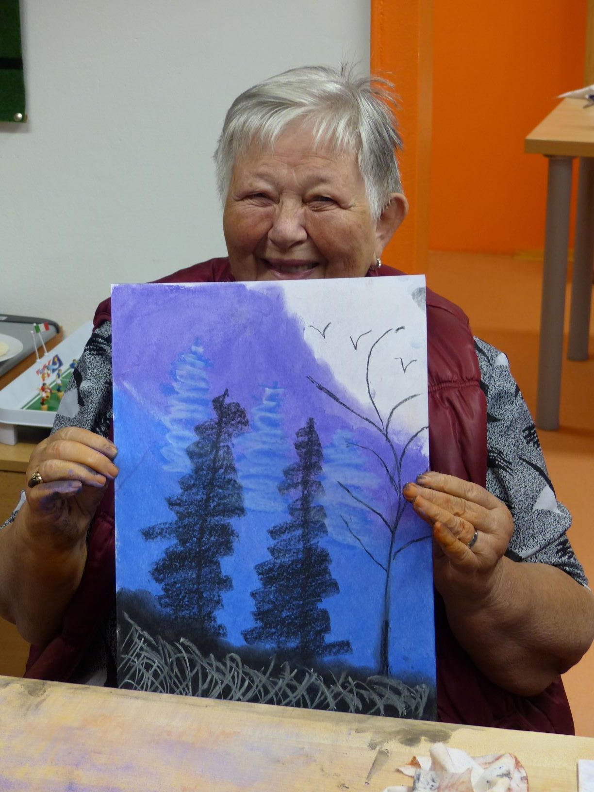 Terapie malováním přináší seniorům nejen plno nových vjemů a zážitků, ale zároveň dochází k rehabilitaci a procvičování jemné motoriky. Senioři mají také velkou radost, když se svým dílem mohou pochlubit rodině a někteří v sobě také objevují své skryté vlohy.