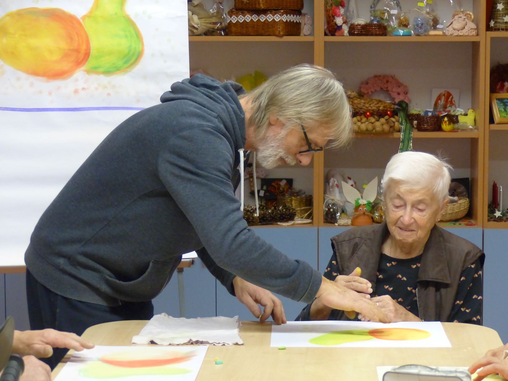 V Domově pro seniory v Klášterci nad Ohří probíhají pravidelné lekce malování s výtvarníkem panem Pavlem Lakomým. Pod jeho vedením se senioři z Domova učí jednoduchou technikou malovat suchým pastelem a minutu po minutě vznikají nádherná díla laděná do podzimních a zimních barev.