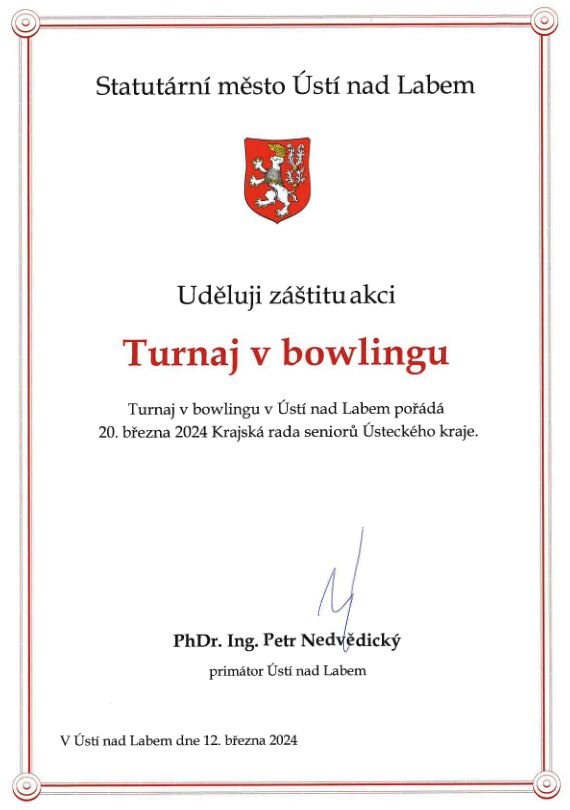 Deset týmů z celého Ústeckého kraje je se dnes utkalo v bowlingovém turnaji, který se konal v Bowling Brunswick clubu na ústecké Klíši. Akci pořádala Krajská rada seniorů Ústeckého kraje pod záštitou primátora města Ústí nad Labem Petra Nedvědického. Všechny účastníky turnaje přivítala předsedkyně krajské rady seniorů Květoslava Čelišová a náměstkyně primátora a zároveň místopředsedkyně krajské rady seniorů Věra Nechybová. „Děkuji všem, co jste přijeli si zahrát v duchu fair play. Doufám, že se tato akce povede natolik, že se stane tradiční a budeme se vídat častěji,“ řekla náměstkyně primátora Věra Nechybová. Seniory přišel podpořit i náměstek primátora Tomáš Vlach.