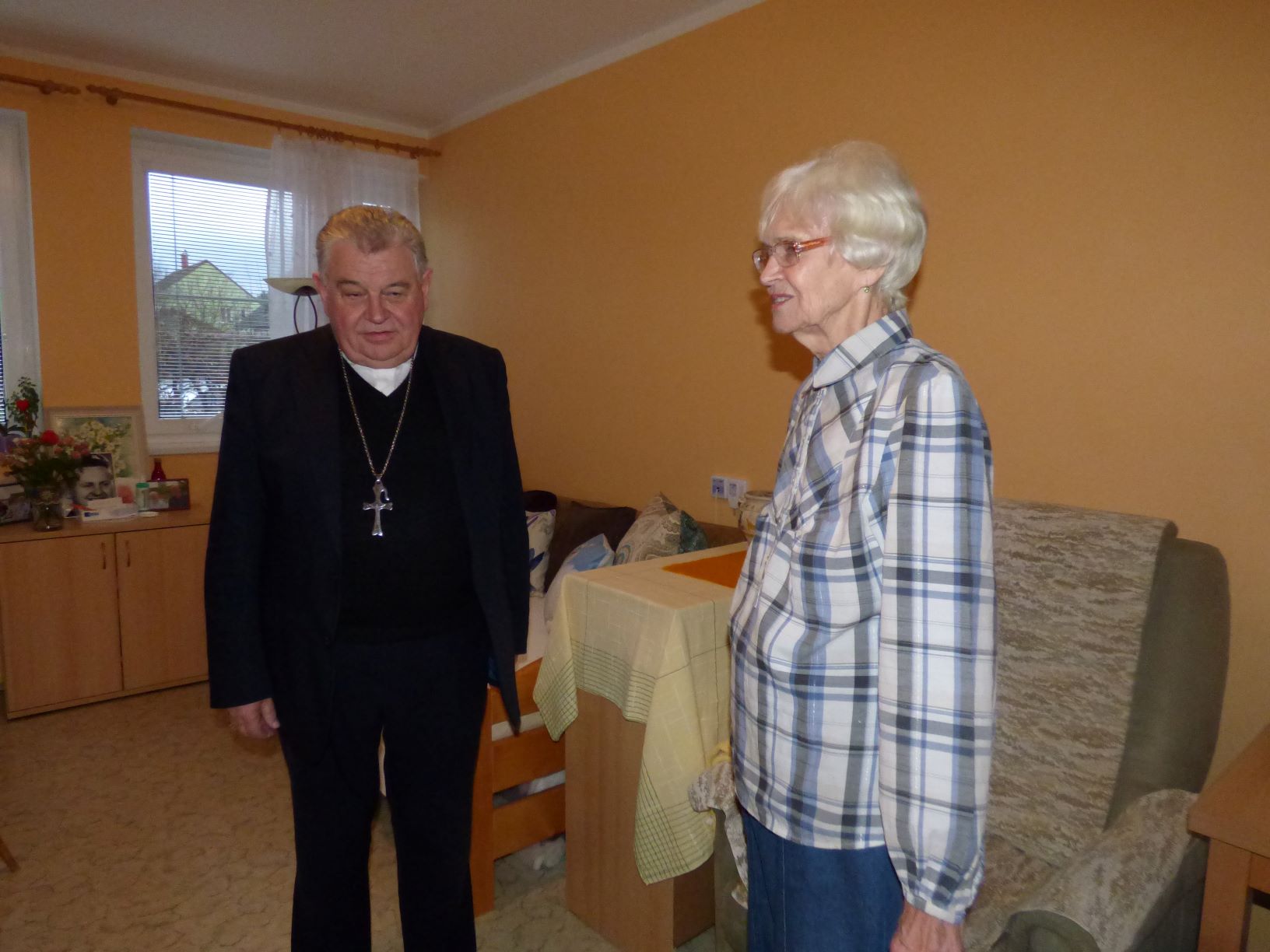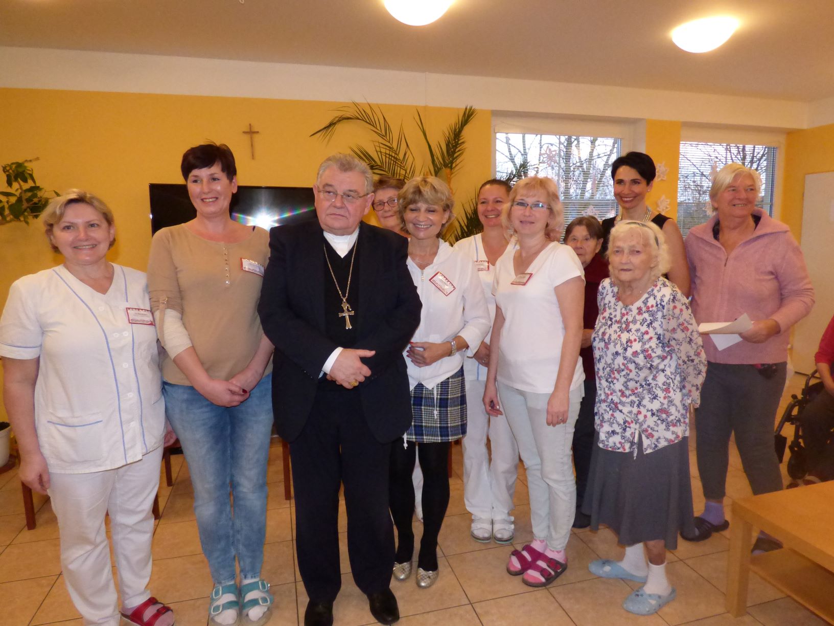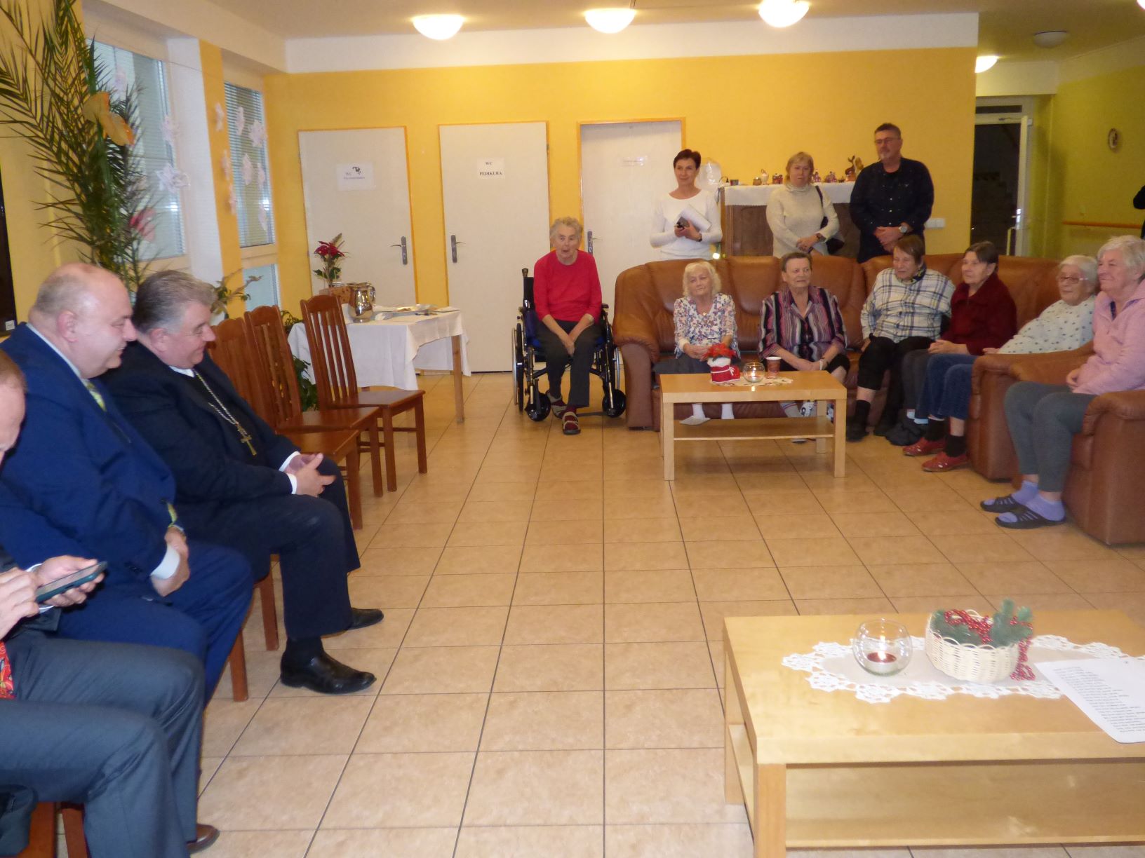 Po prohlídce domova a návštěvě na pokojích těch uživatelů, kteří se ze zdravotních důvodů nemohli zúčastnit společného setkání, proběhlo posezení a diskuze. Pan kardinál dal všem zájemcům požehnání a obdaroval je svatými obrázky a přívěsky na památku.