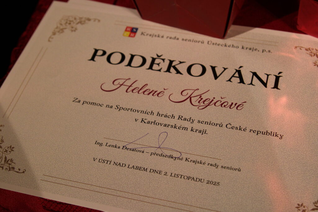 Z rukou předsedkyně Rady seniorů České republiky Lenky Desatové byla oceněna i předsedkyně Krajské rady seniorů Ústeckého kraje Květoslava Čelišová. Ocenění za mimořádný přínos pro rozvoj Krajské rady obdržela její místopředsedkyně Věra Nechybová.