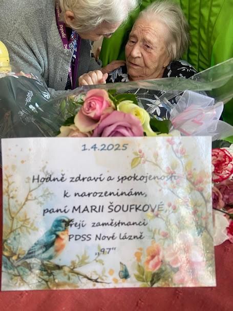 Naše klientka, paní Marie Šoufková, oslavila 1. dubna 2025 významné životní jubileum, a to 97 let. Paní Šoufková se narodila v Duchcově, kde také, před nástupem do našeho domova, prožila celý svůj život. Vyučila se švadlenou a pracovala v Bonexu. S manželem spolu prožili 68 let a vychovali dvě dcery. Jak sama říká, manžel byl její životní láska. Po odchodu do důchodu strávili společně několik sezón jako správci rekreačního areálu v Ratajích nad Sázavou, na tuto dobu má jedny z nejkrásnějších vzpomínek. Za naše zaměstnance přejeme paní Šoufkové vše nejlepší do dalších let.