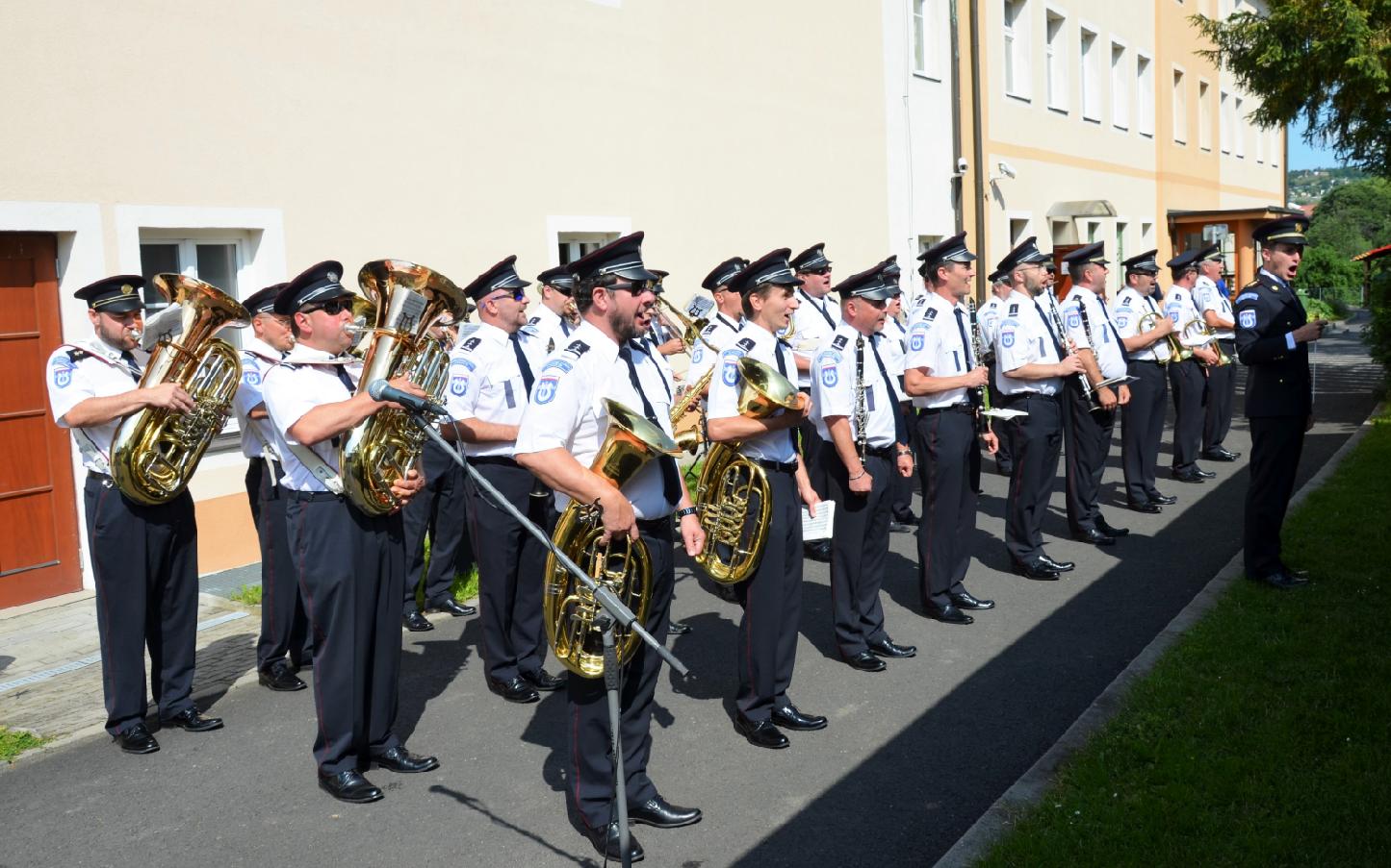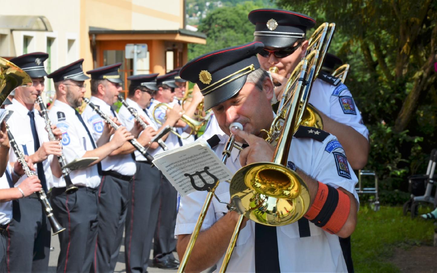 A pak se vše rozeznělo. Hudba Hradní stráže a Policie České republiky, jednatřicet skvělých hudebníků pod dirigentskou taktovkou plukovníka Jana Zástěry, to vše v zahradě kadaňského Domova pro seniory. „Pro všechny u nás dokonalé překvapení. Doslova,“ říká ředitelka zařízení Lenka Raadová.